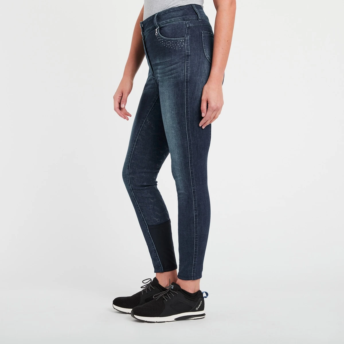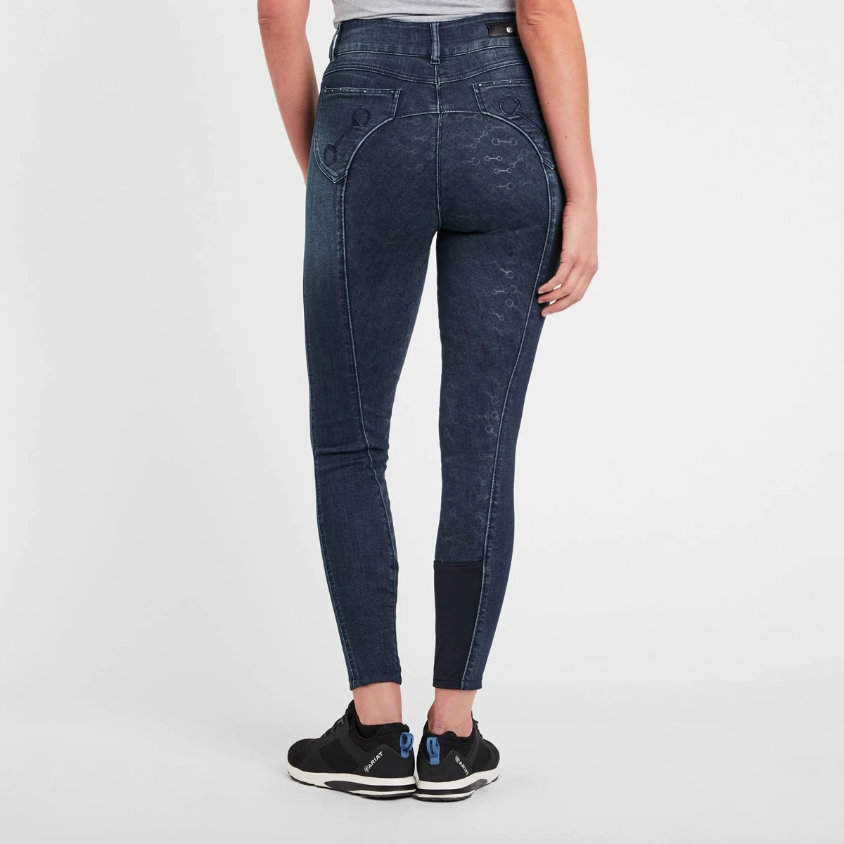 The Horze Kaia Women’s High Waist Denim Full Seat Breeches with a silicone full seat print gives you confidence, support and grip in the saddle. The back pockets are embroidered wi…